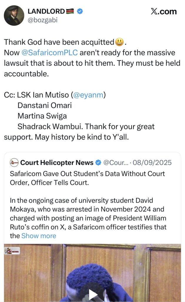 The acquittal of Moi University student David Mokaya by the Milimani Law Courts has opened a legal Pandora’s box that threatens to embarrass both Kenya’s dominant telecommunications company and the Directorate of Criminal Investigations in equal measure, as the young man’s lawyers announced plans to pursue the State for malicious prosecution while the court itself placed Safaricom on notice over what it described as a blatant and illegal breach of a subscriber’s constitutional rights.