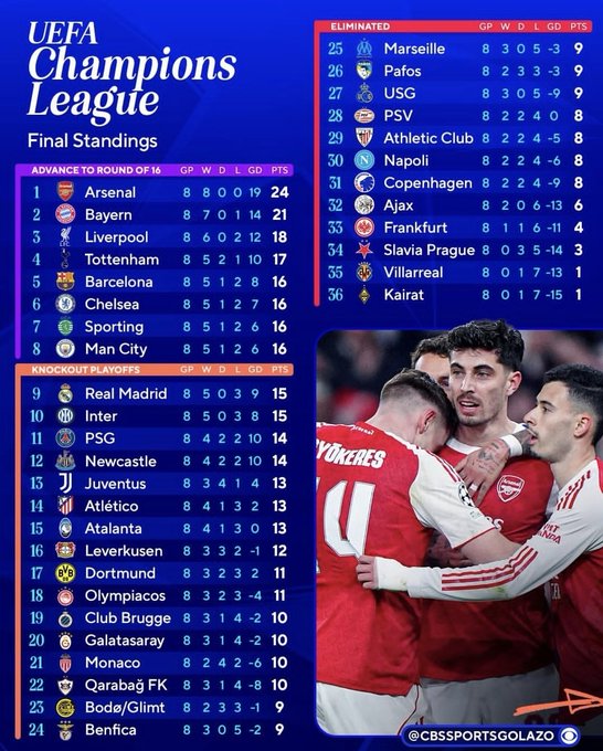 Clubs like Tottenham, Barcelona, Chelsea, Sporting CP, and Manchester City remain in the top eight, yet none can afford to blink. One poor night at this stage, and the table can flip fast…… and this format, is punishing.