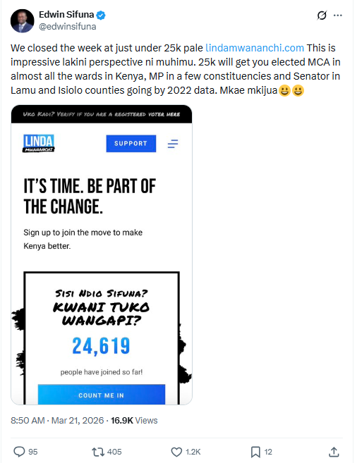 Sifuna’s remarks suggest that the initiative is not merely an online campaign tool, but a potential political force capable of influencing electoral outcomes if the numbers translate into active voter support.