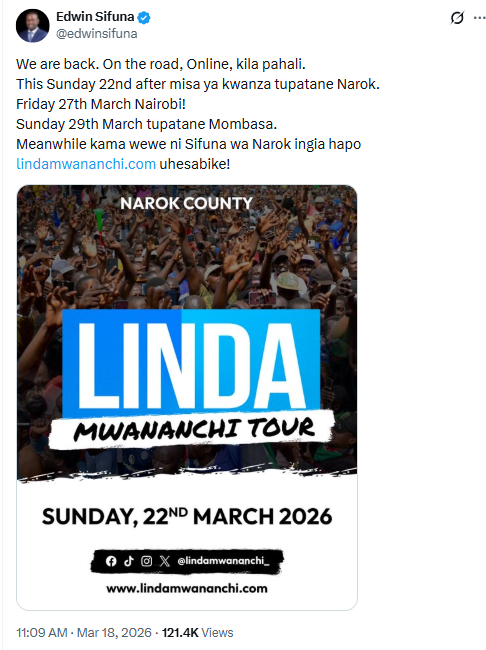 “Friday 27th March, Nairobi! Sunday 29th March tupatane Mombasa. Meanwhile, kama wewe ni Sifuna wa Narok ingia hapo http://lindamwananchi.com uhesabike!” he wrote on X.