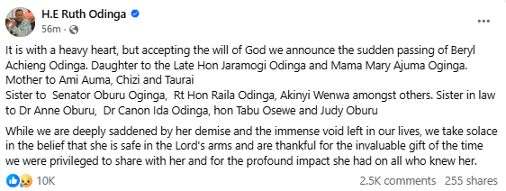 “It is with a heavy heart that we announce the sudden passing of Beryl Achieng Odinga… Daughter of the Late Jaramogi Odinga and Mama Mary Ajuma Oginga. Mother to Ami Auma, Chizi, and Taurus,” Ruth said.