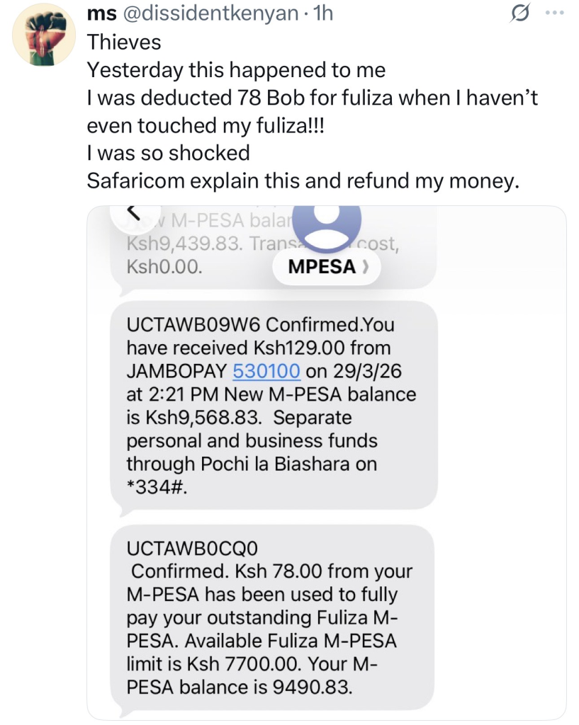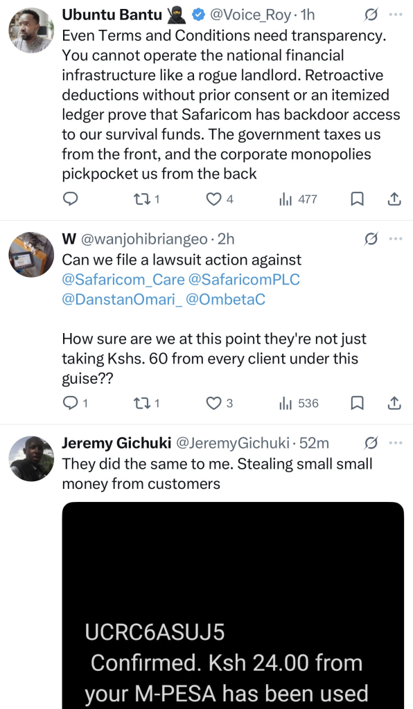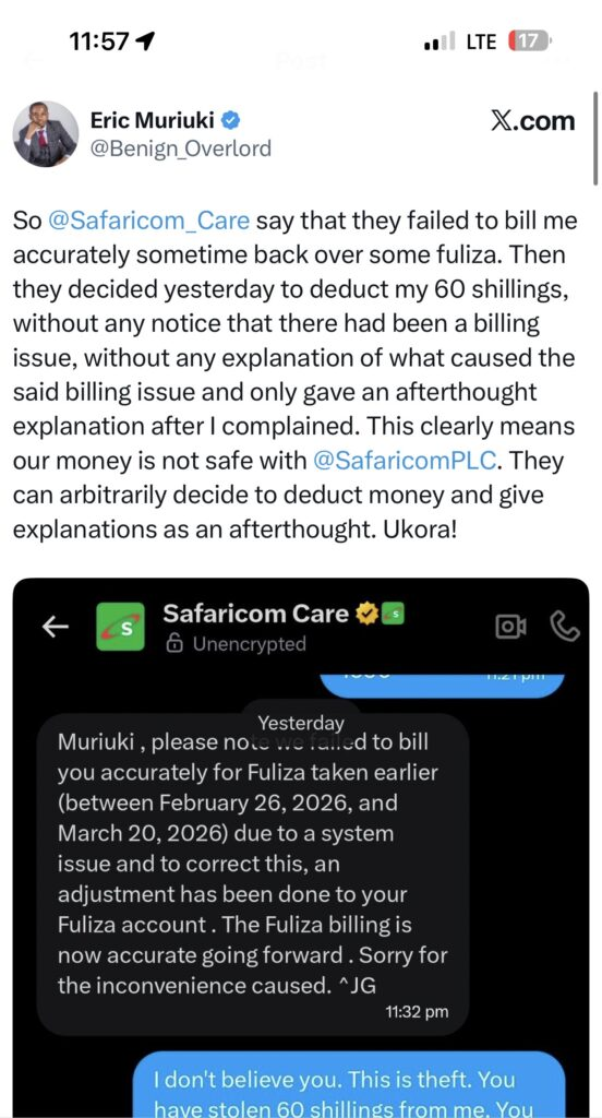 “I don’t believe you. This is theft,” Muriuki wrote, adding that Kenyans’ money was no longer safe with the telco. His remarks quickly gained traction online, triggering a wave of similar complaints.